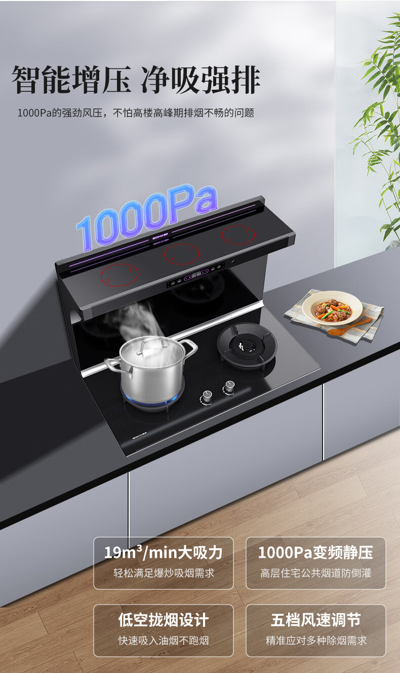傳統(tǒng)廚房的三大痛點,你中招了嗎?油煙亂竄,健康堪憂,傳統(tǒng)油煙機吸力弱、距離灶臺遠,油煙吸不干凈,不僅讓廚房油膩膩,還危害家人健康。長期吸入油煙,可能引發(fā)呼吸道疾病,甚至增加患癌風險!火力不穩(wěn),做飯全靠運氣,普通燃氣灶火力不均,爆炒不夠猛,燉煮不夠穩(wěn),炒菜變水煮菜,美食變黑暗料理,下廚體驗大打折扣!空間凌亂,收納成難題,傳統(tǒng)廚房電器分散,油煙機、灶臺、消毒柜各自為政,占用大量空間。加上櫥柜設(shè)計不合理,調(diào)料、廚具亂堆亂放,廚房秒變雜物間!